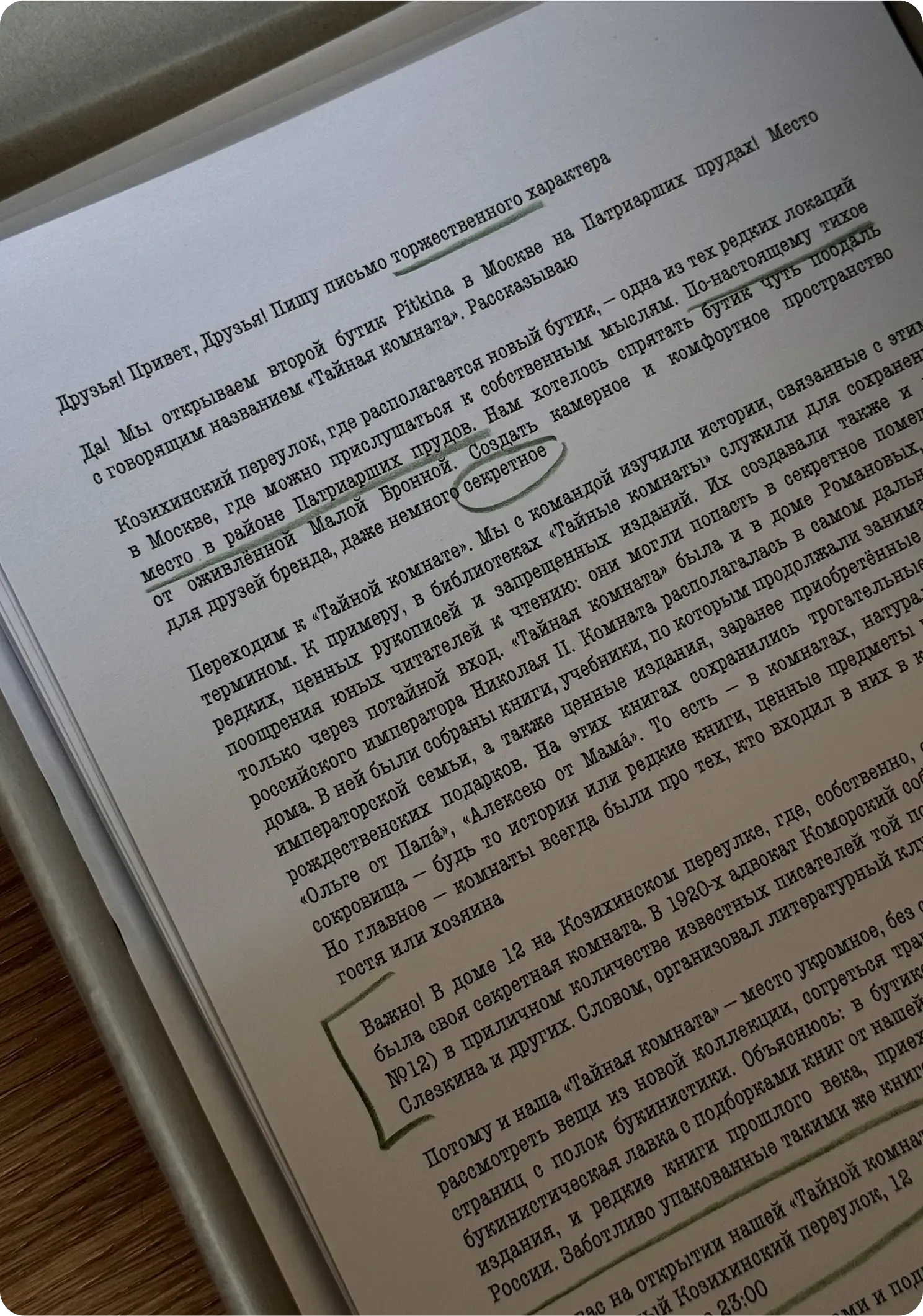 В доме 12 на Козихинском переулке, где открыл свои двери бутик, тоже была своя секретная комната. В 1920-х адвокат Коморский собирал здесь (в квартире № 12) известных писателей той поры: Булгакова, Ильфа, Слезкина и других — организовал литературный клуб.
